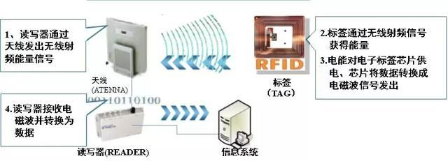 RFID的工作原理很簡(jiǎn)單:標(biāo)簽進(jìn)入磁場(chǎng)后,讀寫器會(huì)感應(yīng)到標(biāo)簽信號(hào),標(biāo)簽通過無線射頻信號(hào)獲得能量(無源標(biāo)簽或被動(dòng)標(biāo)簽)或標(biāo)簽主動(dòng)發(fā)送某一頻率的信號(hào)(有源標(biāo)簽或主動(dòng)標(biāo)簽),然后解讀器讀取電磁波并轉(zhuǎn)化為數(shù)據(jù),送至中央信息系統(tǒng)進(jìn)行有關(guān)數(shù)據(jù)處理。