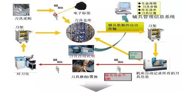 刀具管控的目的是實(shí)現(xiàn)對(duì)刀具全生命周期信息管理,及時(shí)的了解刀具的使用和庫(kù)存狀態(tài)和位置。在刀具采購(gòu)入庫(kù)前,為刀具加裝電子標(biāo)簽,作為刀具的唯一身份識(shí)別信息。在刀具的調(diào)度和使用過程中,通過及時(shí)采集刀具的信息,能在系統(tǒng)中清楚的了解刀具是否已經(jīng)上刀,具體對(duì)應(yīng)的機(jī)床以及使用的周期和時(shí)長(zhǎng)等。通過及時(shí)跟蹤刀具位置狀態(tài)、使用狀態(tài),企業(yè)能及時(shí)的了解刀具磨損情況并進(jìn)行更換,保證刀具的使用安全。